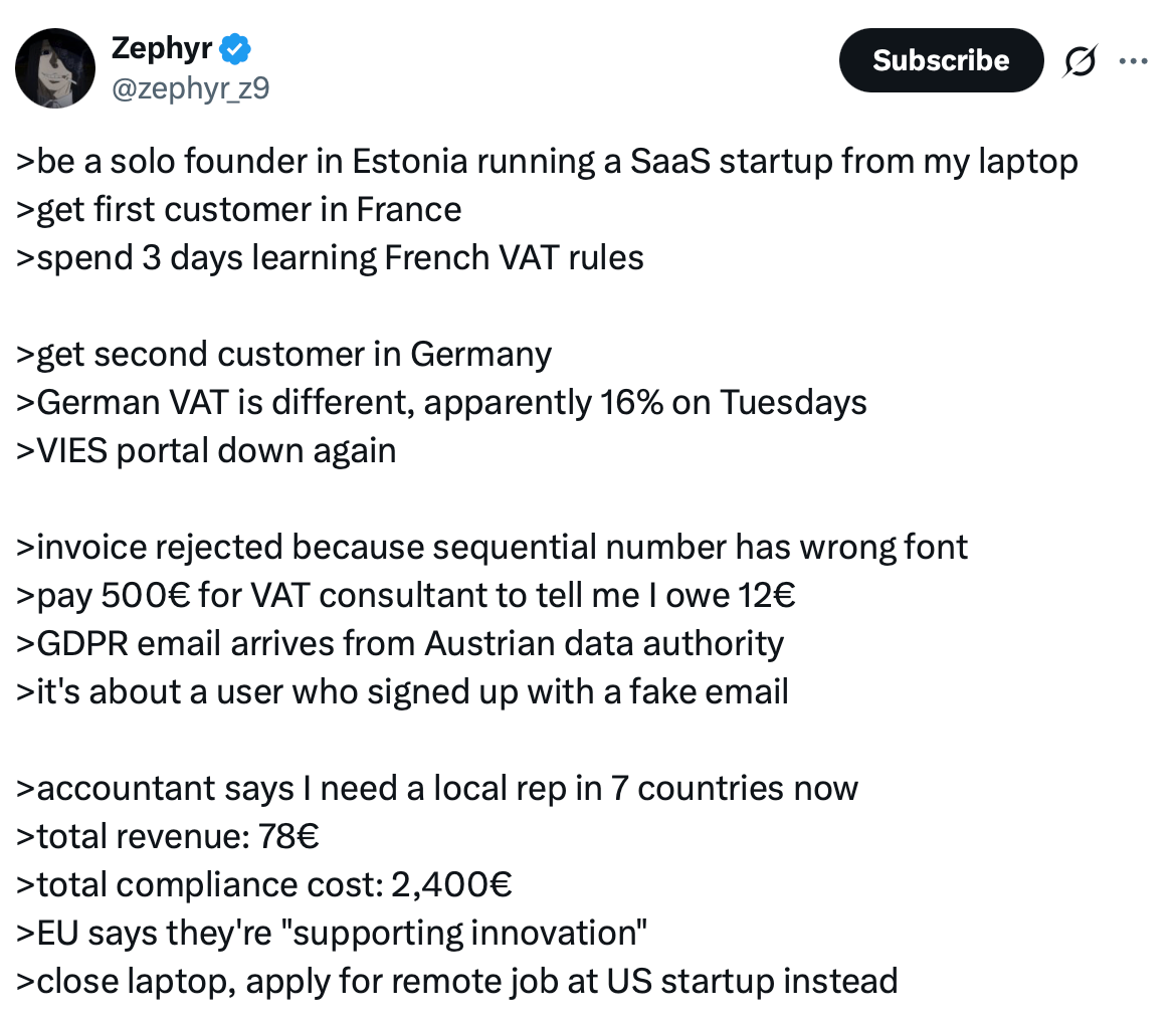 Ma reggel feldobta az X (Twitter) ezt a posztot az EU áfás szabályairól - nekem is van hasonló élményem.