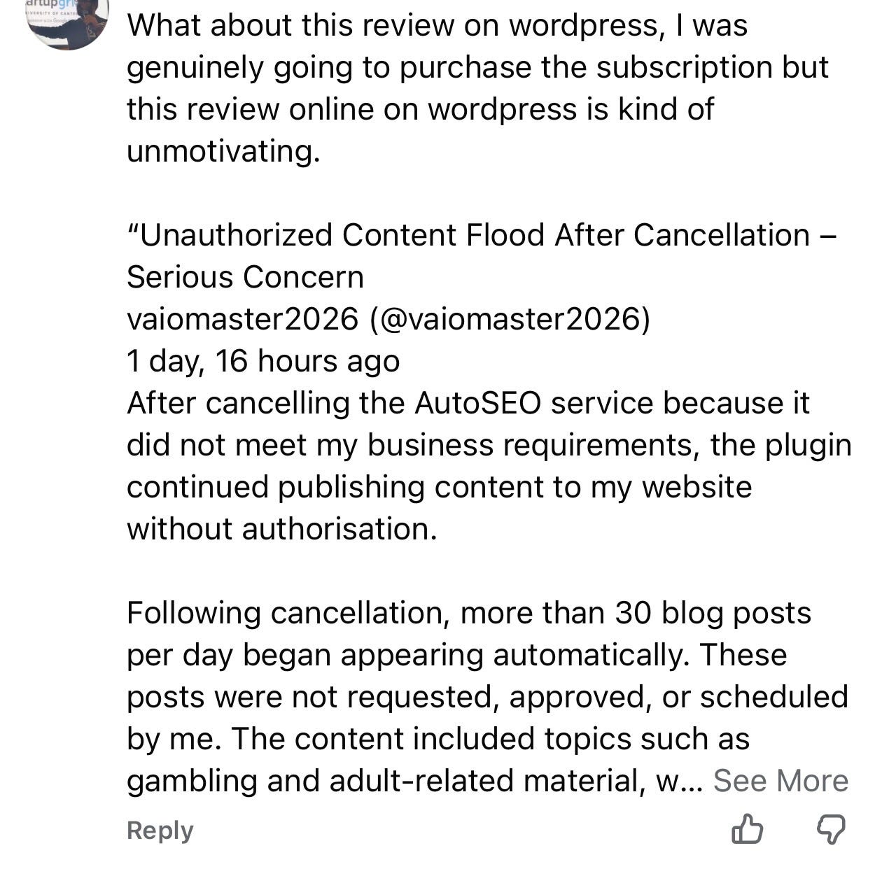 Például azt írta a reviewer, hogy miután kikapcsolta az AutoSEO-t, mi továbbra is napi 30 cikket posztoltunk engedély nélkül a honlapjára.